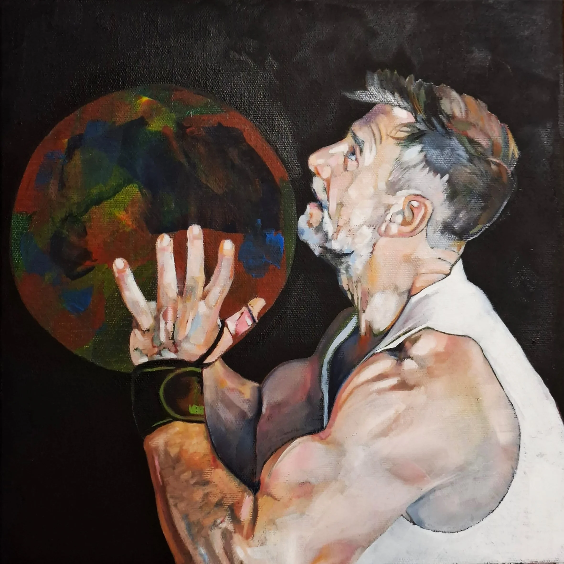 A painting of a woman with short hair, holding her arm across her chest, with an abstract and colorful style.