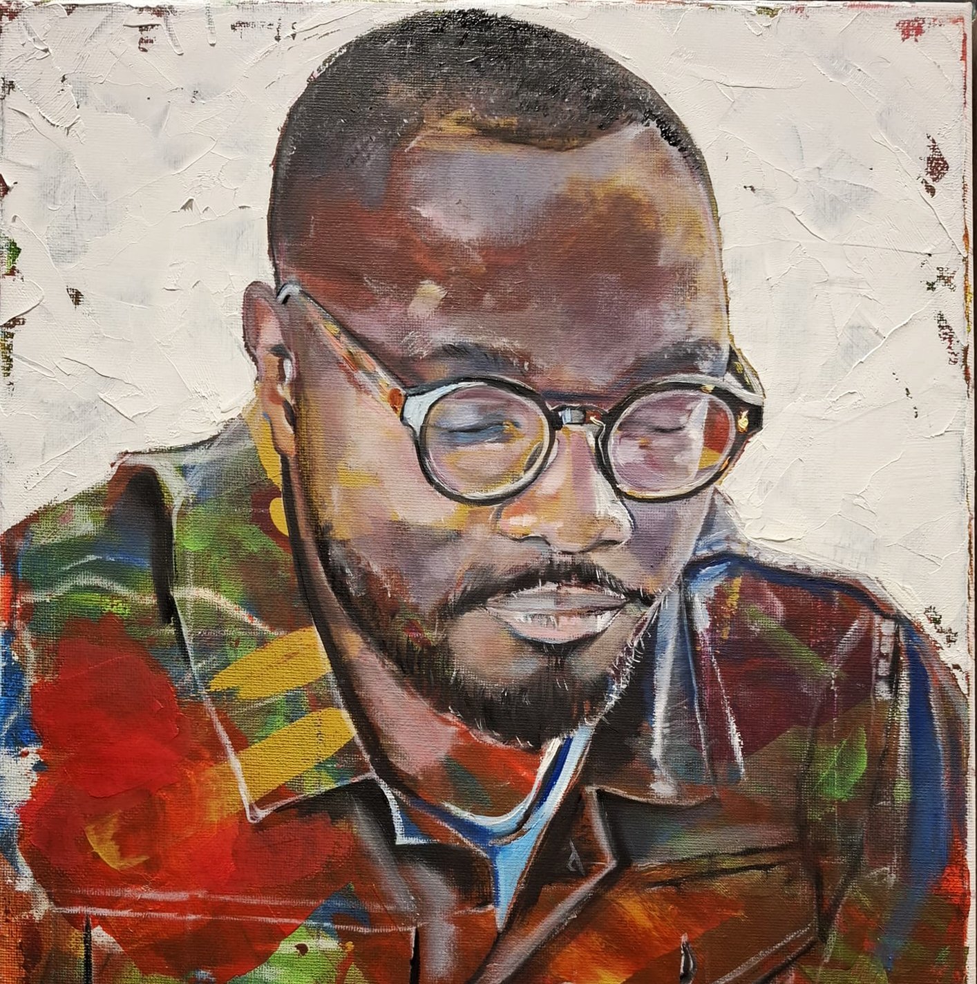 Digital painting of a man wearing a colorful jacket, sitting outdoors with greenery in the background, with artistic watercolor effects.